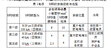 由于雷電沖擊波的主要能量集中在從工頻附近幾十赫茲到幾百赫茲的低端,所以,雷電沖擊波能量很容易與工頻回路發(fā)生耦合、諧振。雷電沖擊波從電源線路進(jìn)入電子設(shè)備的概率比從信號線中進(jìn)入的概率要高得多。據(jù)統(tǒng)計(jì),約有80%的電子設(shè)備雷擊損壞事故是由電源線路引入閃電電涌造成的,因此,應(yīng)特別加強(qiáng)系統(tǒng)中設(shè)備電源的防雷措施。在選型時(shí),要選擇殘壓小、響應(yīng)時(shí)間快的SPD。電源 SPD的選擇、安裝情況如表1所示。