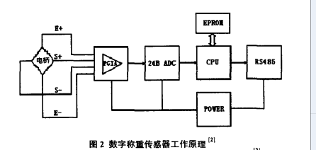 數(shù)字稱重傳感器工作原理如圖2所示,它由模擬傳感器、放大器、A/D轉(zhuǎn)換器、CPU、存儲(chǔ)器(內(nèi)含補(bǔ)償軟件和自控軟件),電源和通訊模塊組成。一般的數(shù)字傳感器只有AD轉(zhuǎn)換和通訊功能,比如我公司的“DIGITAL LOAD CELLS”,更高級(jí)的智能型數(shù)字傳感器能自動(dòng)對(duì)傳感器的零點(diǎn)、溫度、非線性、滯后、蠕變性能等進(jìn)行數(shù)字化補(bǔ)償,最后輸出數(shù)字信號(hào)。比如”POWERCELL RLOAD CELLS”.