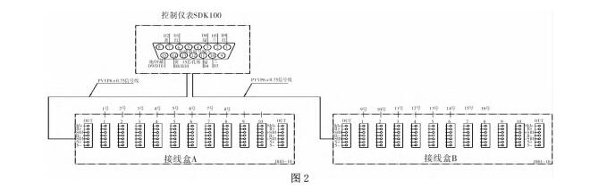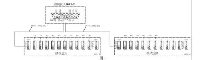 本臺(tái)地磅長(zhǎng)度大,需用傳感器16只,一般的標(biāo)準(zhǔn)接線盒只能接10只傳感器,因此我們配了兩只接線盒,圖1中A接線盒接入10只稱重傳感器信號(hào)和B接線盒接入6只稱重傳感器信號(hào)由兩條信號(hào)線分別接入稱重控制器的傳感器接口。此接法在計(jì)量檢定時(shí)秤臺(tái)間有較大誤差。