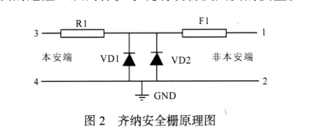 齊納安全柵基本電路如圖2所示,電路由快 速熔斷器F1,限壓元件VD1、VD2(齊納二極管)和 限流電阻三部分組成。正常操作條件下,非本安 端1、2之間所加的電壓低于最高壓Vmx(更低于齊 納二極管的齊納電壓),此時VD1、VD2處于不導 通狀態(tài),除有極微小的漏電流以外,是“開路” 狀態(tài),安全柵電路等效于一個電阻串聯(lián)在信號回 路內(nèi),只要漏電流小于規(guī)定值,安全柵電路就不 會影響系統(tǒng)的正常工作。