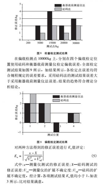 在遞增稱量點 200kg、5000kg、15000kg、20000kg、 30000kg 上,分別使用砝碼和衡器載荷測量儀檢定稱量誤差,全部檢定測試結果如圖 8 所示。如結果所示,各檢定點誤差均符合規程規定的誤差要求。采用砝碼法的測試結果誤差小于采用衡器載荷測量儀法誤差,結果的趨勢符合理論分析結論。