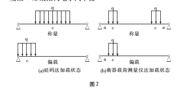 本文主要對地磅在偏載和稱量性能檢定時的狀態進行仿真分析和測試。對承載器進行力學分析建模,將其沿長度方向簡化為一維模型。采用砝碼法加載時模型簡化如圖 2( a) 所示,采用衡器載荷測量儀法簡化模型如圖 2( b) 所示。