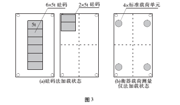 在采用砝碼法進行中準確度級地磅檢定時,使用多塊 M1 級鑄鐵砝碼。砝碼放置時為裝載方便并保證安全,疊放層數通常不宜過高; 在進行稱量檢定時,砝碼需要平鋪在承載器上。而采用衡器載荷測量儀法檢定時,根據量程選用不同標準載荷單元組,每個標準載荷單元通過承壓板向承載器加載。本文為分析方便,選用由單節承載器和 4 只稱重傳感器構成的 SCS - 30 型中準確度級U型梁結構地磅。
